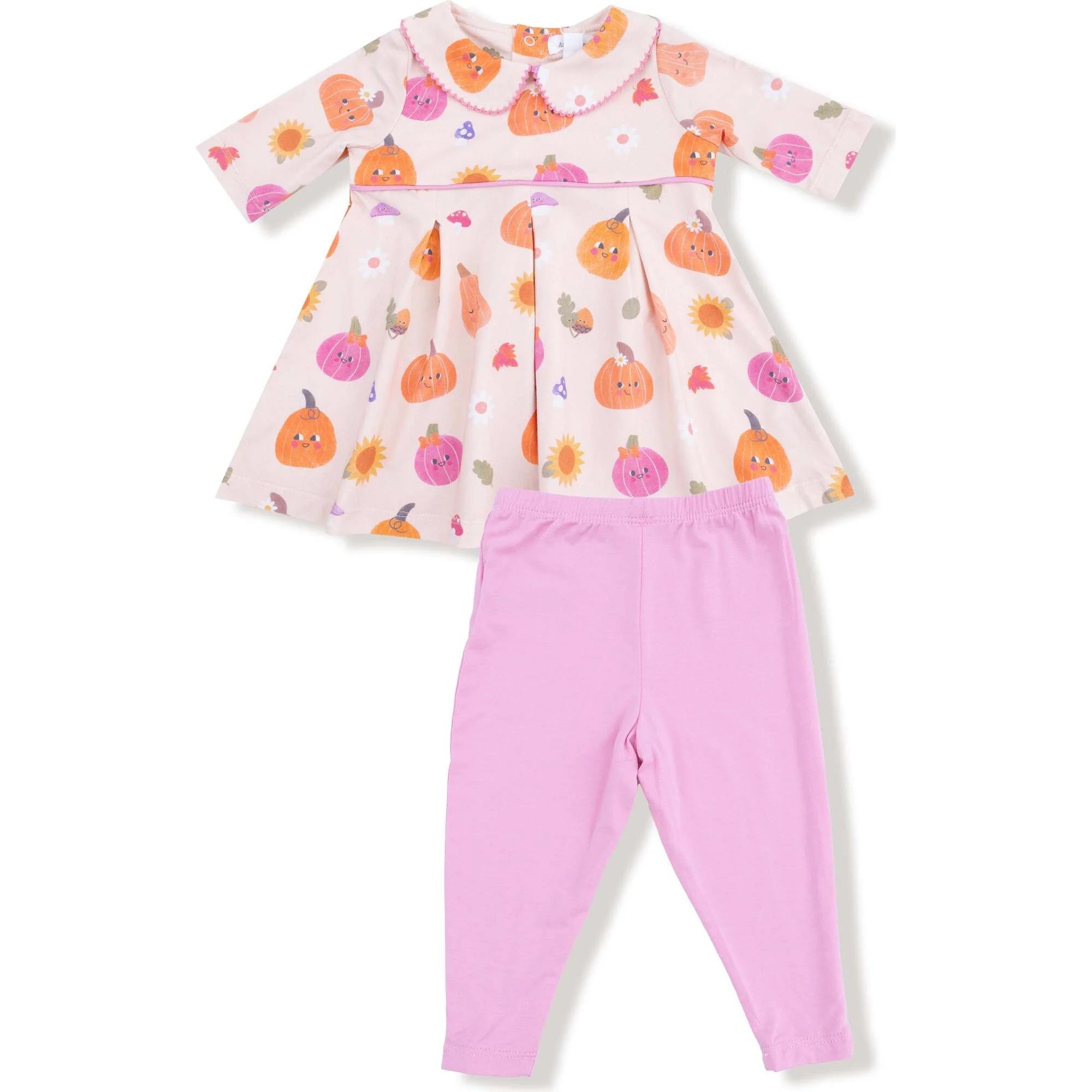 Autumn Pumpkins Pink Box Pleat Dress W/ 3/4 Sleeve and Bamboo Legging