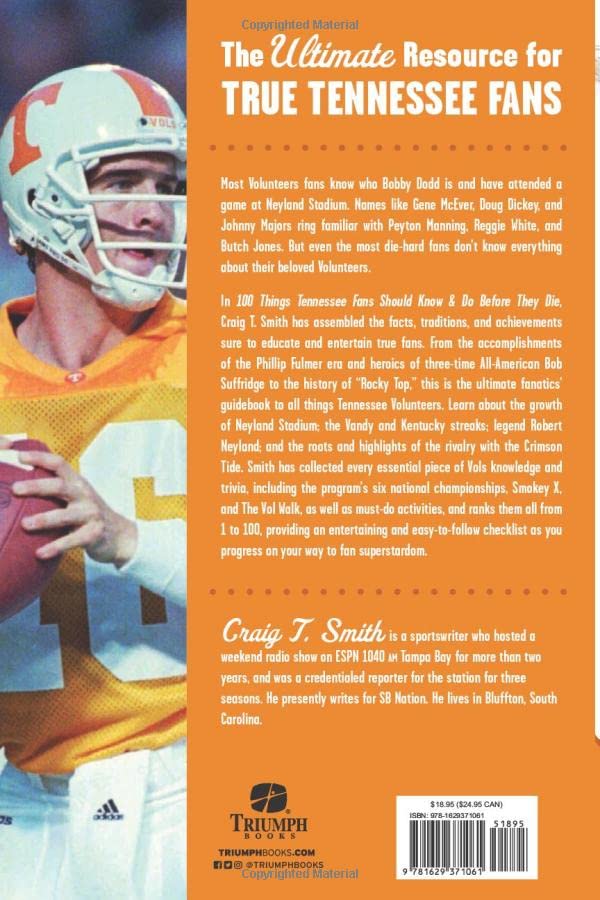 Most Tennessee fans have attended a game at Neyland Stadium, seen highlights of a young Peyton Manning, and remember where they were when the Volunteers won the 1999 Fiesta Bowl. But only the truly die-hard fans can recite the words to "Down the Field," and know the history of "Rocky Top." 100 Things Tennessee Fans Should Know & Do Before They Die reveals the most critical moments and important facts about past and present players, coaches, and teams that are part of the storied history that is UT football. Whether you're a die-hard fan from the Phillip Fulmer era or a new supporter of Butch Jones, this book contains everything Volunteer fans should know, see, and do in their lifetime. It offers the chance to be certain you are knowledgeable about the most important facts about the team, the traditions, and what being a Volunteer fan is all about.
