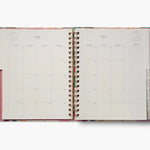 A big planner for big plans. Our large-format planner is spiral bound with a sturdy hard cover and a gold elastic band to hold it closed. Inside, you’ll find monthly and weekly views, inspirational quotes, sections for notes and goals, pocket folders for storage, and 2 sticker sheets. Planners span August 2025-December 2026.