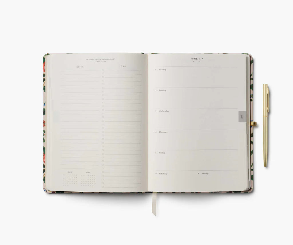 Spanning January 2026 to December 2026, this hardcover planner features printed Gracie florals, a foil-stamped year, and an elastic closure. In addition to weekly and monthly views, the interior includes space for weekly notes and to-dos, a list of celebrations, a pocket folder for storage, and a gold pen.