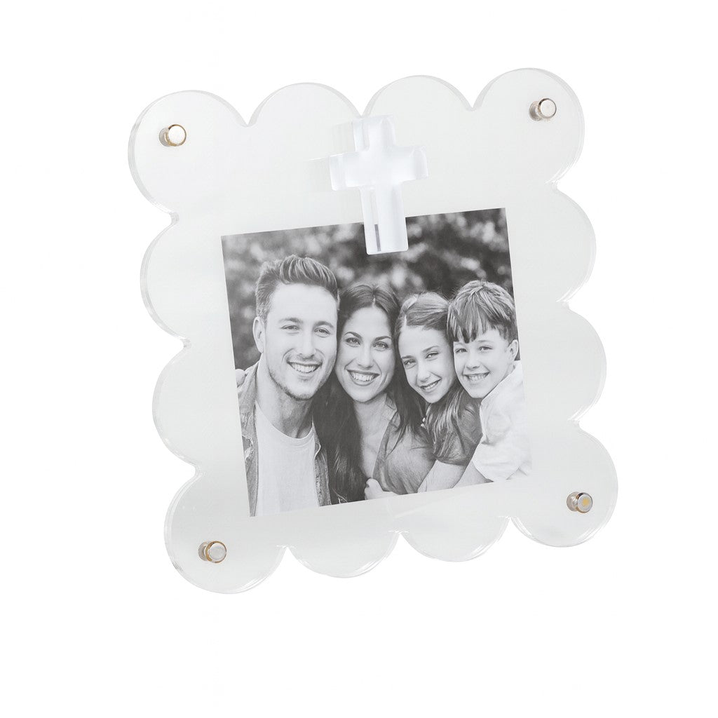 Scallop acrylic frame features layered acrylic cross, corner gold rivets and holds 3" x 3" photo. Easel back.