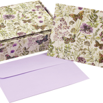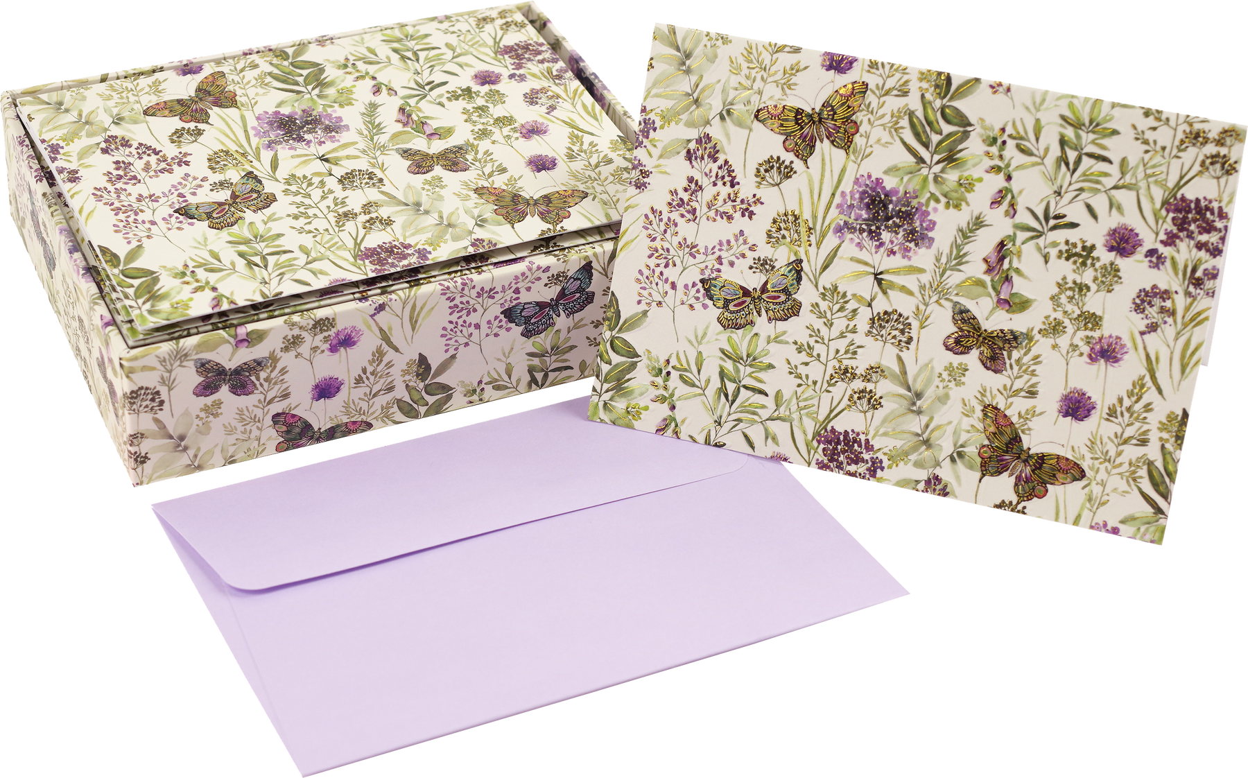 Four butterflies take flight above a meadow of wildflowers on these elegant note cards.