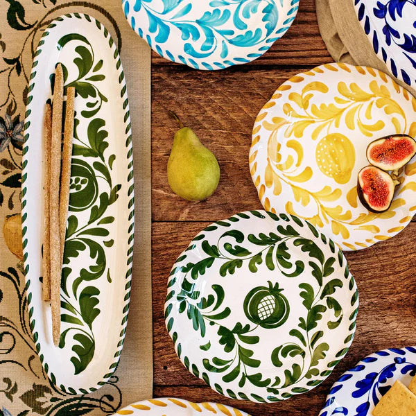 The bold patterns and rich glazes of Arezzo harken back to the centuries-old tradition of Majolica. The Arezzo Green Narrow Oval Platter brings fresh life to the style's intricate designs with its organic, confident brushstrokes and mix-and-match possibilities.