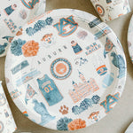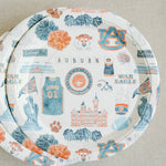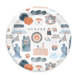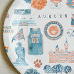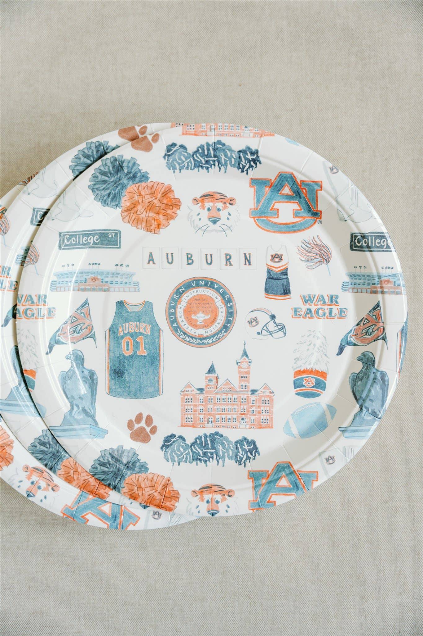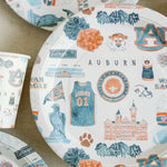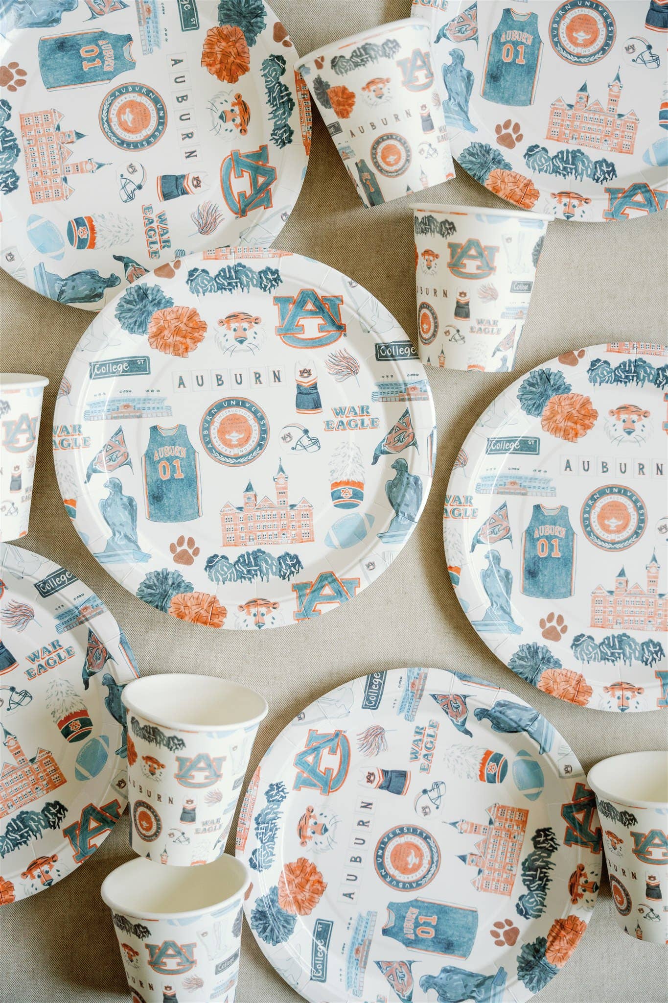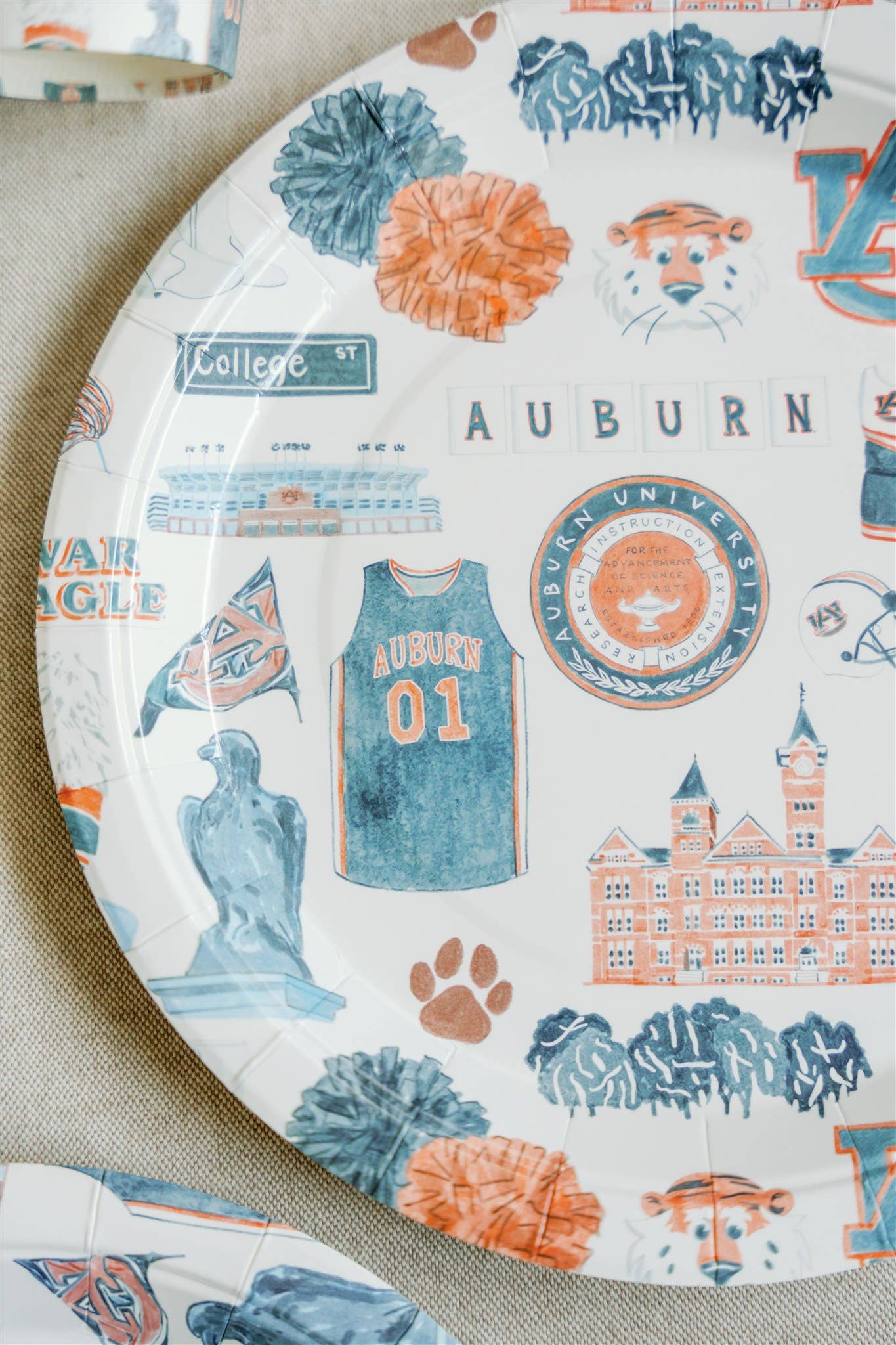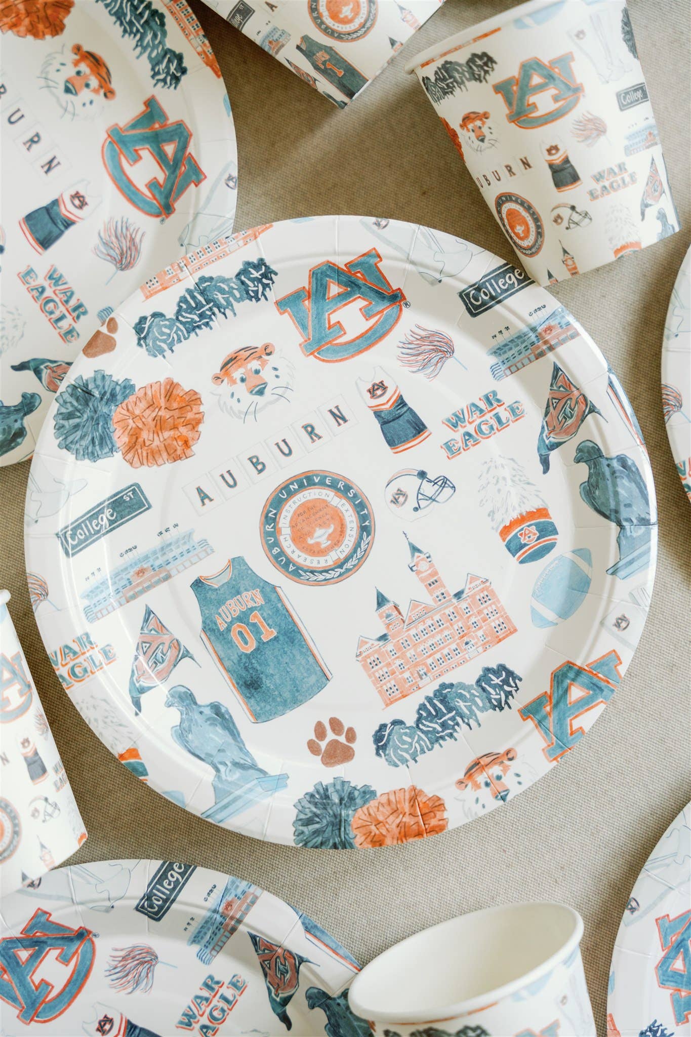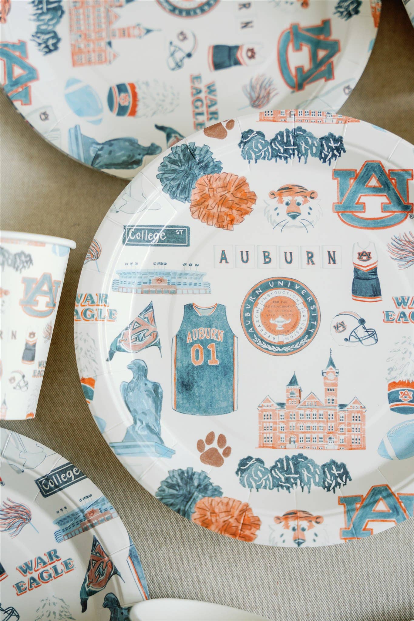 OFFICIALLY LICENSED BY AUBURN UNIVERSITY Pack of (10) 9 inch paper plate pack. Features watercolor images of Aubie, Samford Hall, the Auburn seal, Jordan-Hare Stadium, Toomer's Trees, and more! Perfect for fall tailgates! Collegiate, war eagle, basketball, football, cheerleader, shaker, tailgate, party, paper plate, tiger