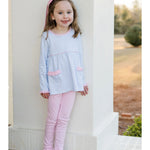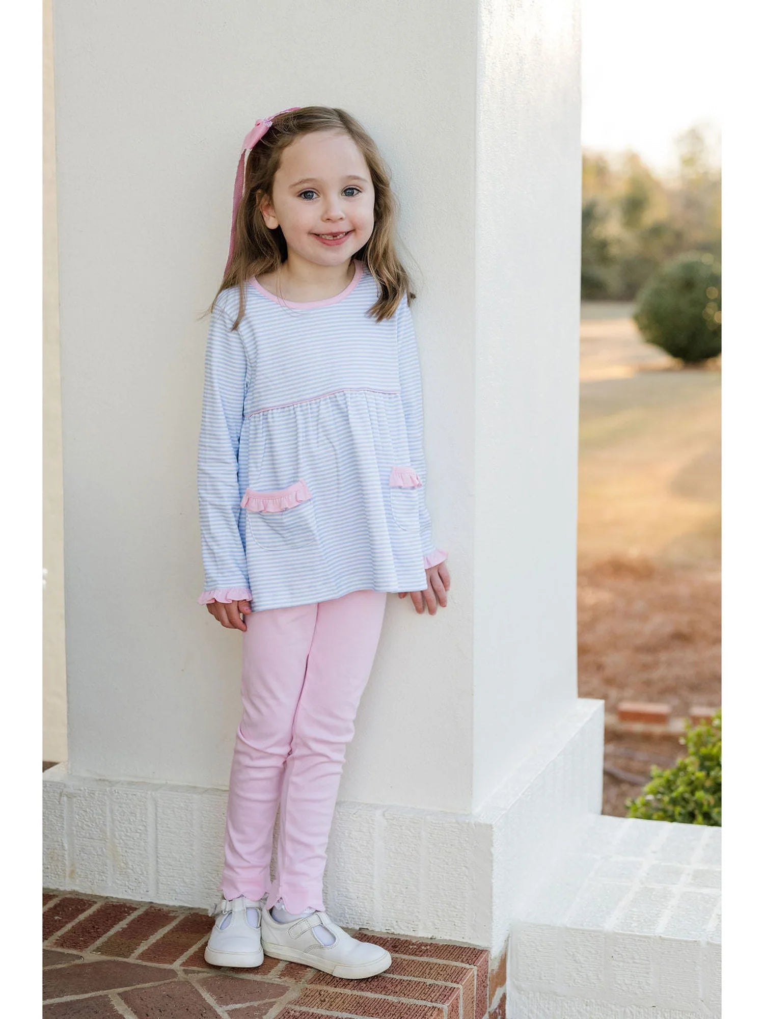 Bring instant charm to your little girl's closet with the Basic Stripe Meggie Legging Set! This delightful duo pairs soft, stretchy pink leggings with a scalloped hem alongside an adorable blue and white striped top. Sweet pink accents frame the neckline, cuffs, and front pockets for extra personality. Mix, match, and play—this set lets her move freely while looking absolutely precious!