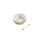 3-piece set. Set of two hand-painted stoneware tidbit dishes. Comes with brass plate metal spoon.