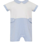 The Peter Pan collar in coordinating blue stripes adds a refined touch, while side button tabs create subtle structure and boutique charm. Crafted from a soft, breathable knit fabric, this romper keeps baby comfortable while still looking picture-ready for any occasion.