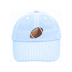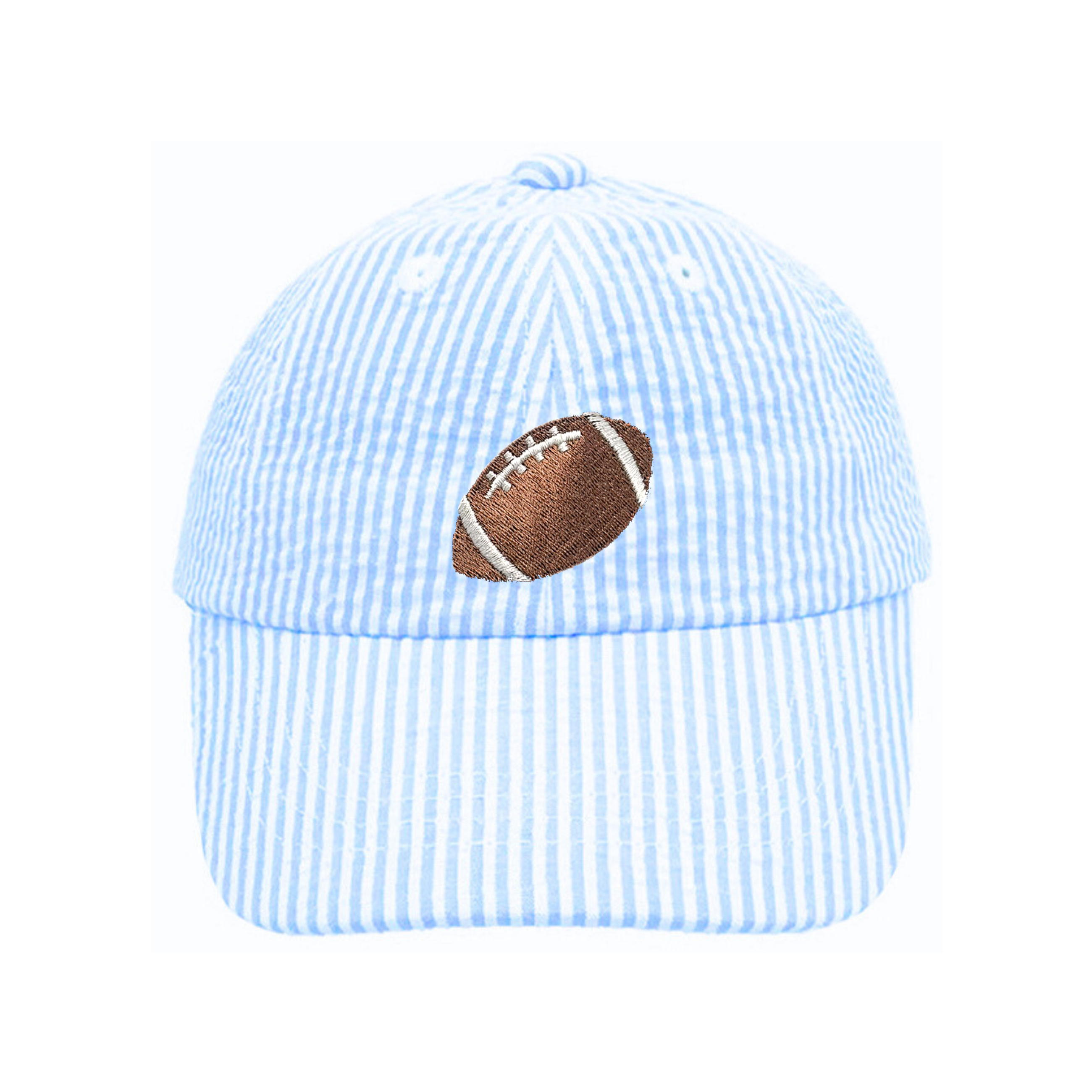 Our bestselling Game Day Collection just got a colorful dose of Football hats ready to take your little ones from the stadium to the sidelines in the sweetest style. Blue Seersucker Baseball Hat with football embroidery. * Soft-structured 6-panel baseball hat * Tuck strap with metal slide closure * Baby-sized cap fits most children from ages 6-24 months old * Youth-sized cap fits most children from ages 2-7 years old