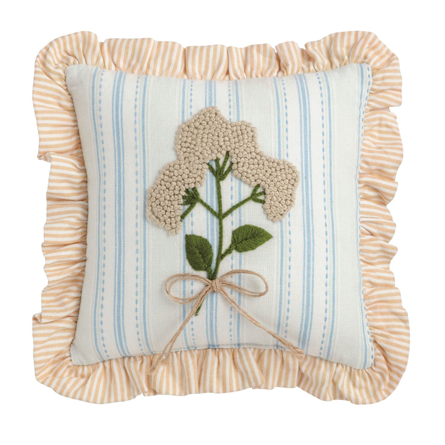 Woven cotton pillow features embroidered flowers and ruffle flange. Canvas backing.
