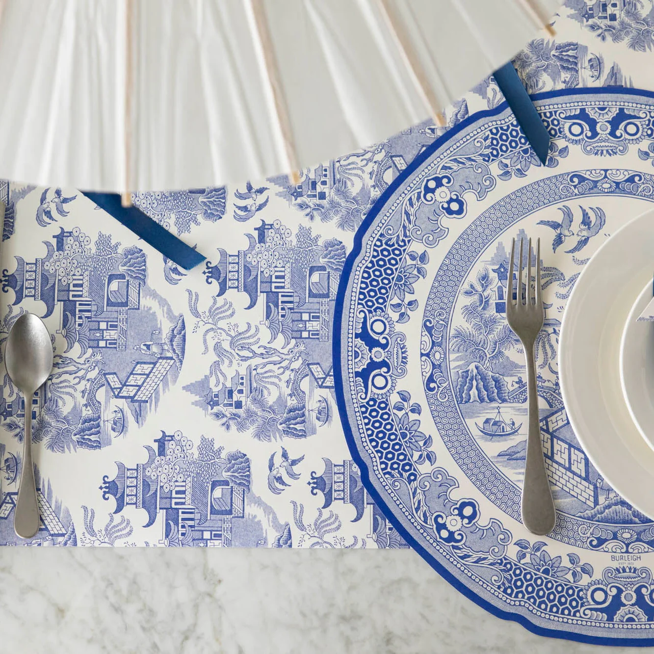In collaboration with Burleigh, we've brought elements of the classic Blue Willow design to your table as a runner. This wide width paper toile is reminiscent of a luxurious fabric design. Mix and match between the Blue Willow story, Regal Peacock story and Asiatic Pheasant story to bring our entire Burleigh collection to life on your table.