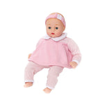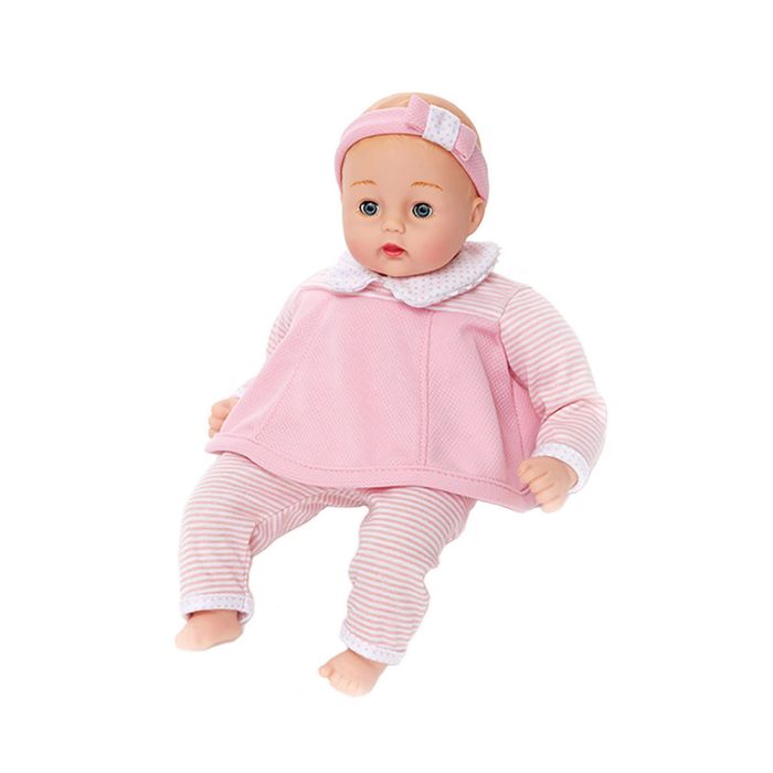 This beautiful baby doll with blue eyes and light brown painted hair wears a soft, pink knit top and pants. The shirt, pink textured knit with princess seams and self-binding, has a pink and white striped yoke and sleeves. The pink and white striped knit pants have mini, pink polka dot binding at the ankles and an elastic waistband. A pink knit headband with a white bow that has mini, pink polka dots completes this baby's outfit. Ages 2+