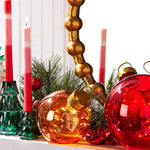 These beautiful oversized glass ornaments are sure to be a treasured addition to your holiday dècor. Flat bottoms allow them to sit securely on a table or shelf, and inner LED string lights make them glow when lit. Simply remove the gold cap to access the hidden on/off switch and battery compartment.