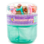 • slimes have a diameter of 3.3 inches and a height of 1.8 inches without the plastic dome. The plastic dome adds 1.5 inches to the height. Each jar contains 7 oz of slime.