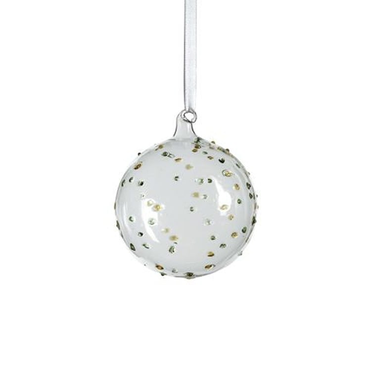 Enhanced Description: Add a touch of elegance to your holiday decor with this 4" clear glass ball ornament adorned with colorful glass dots. Hang it on your tree or display it in a bowl for a festive touch. This ornament is perfect for adding a pop of color to your Christmas decorations. Summarized Description: This 4" clear glass ball ornament is decorated with colorful glass dots, adding a touch of elegance to your holiday decor. Hang it on your tree or display it in a bowl for a festive touch. Perfect for adding a pop of color to your Christmas decorations.
