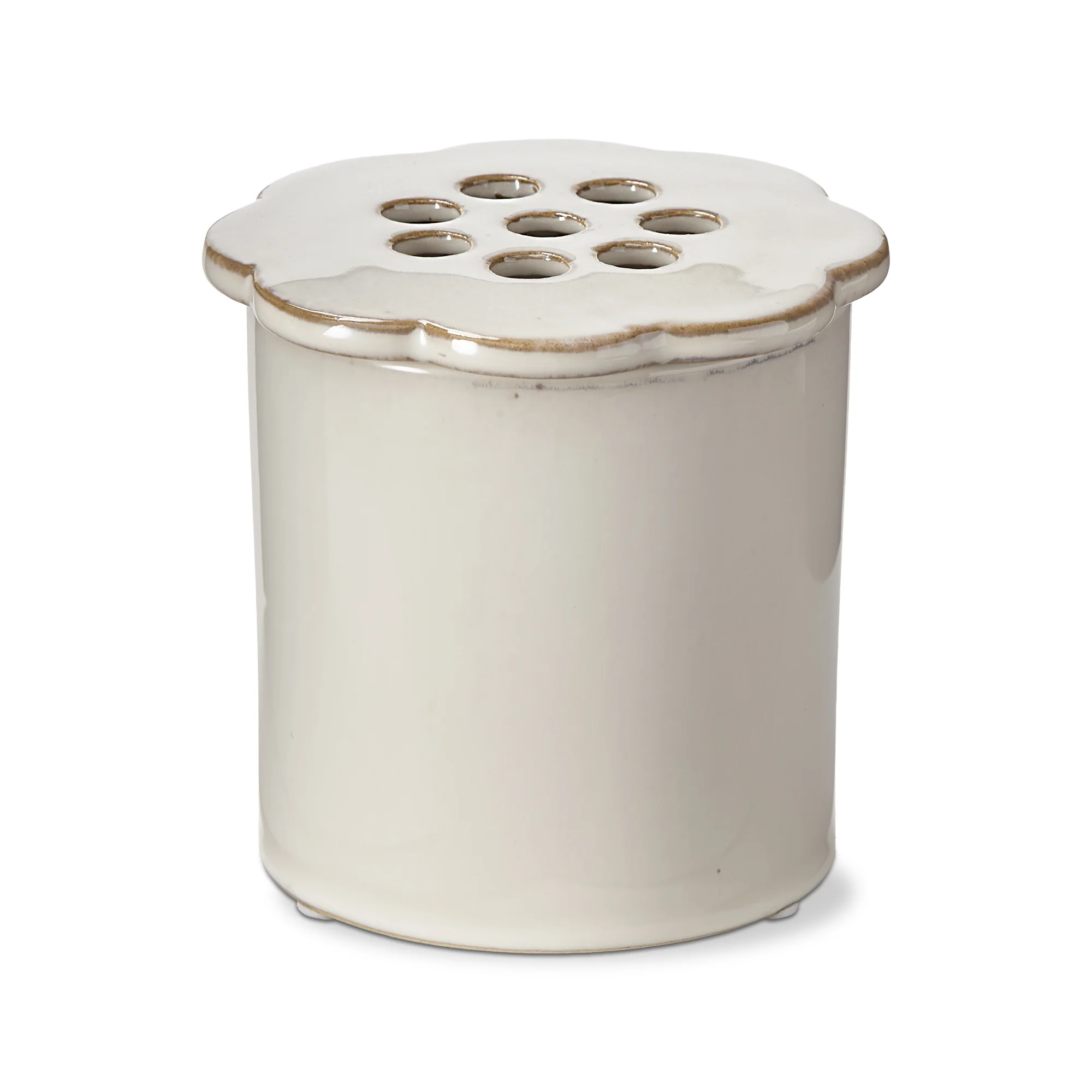 A beautifully crafted frog vase, perfect for showcasing a wide selection of small floral accents. features stoneware construction with reactive glaze details and scalloped lid, this is designed to hold small flowers, replacing the need to use non-biodegradable foam. great for plant propagating and arranging flowers, stems and botanicals. makes a perfect gift for any plant lover, florist or hobby flower arranger.