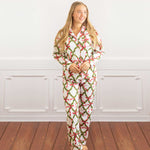 Deck the halls while making a statement this holiday season in our Garland Flannel PJ Set. This cute & comfortable set is the perfect way to decorate the tree, wrap presents or relax in style on Christmas morning. With the delicate button front two-piece silhouette, the PJs exude sophistication & poise. The vibrant novelty graphic print mixes preppy and classic holiday making it the perfect fit for the holiday season. Get ready to take on each day this holiday season feeling stunningly chic yet effortlessly comfortable in this uniquely elegant set! **MINIMUM OF 6 UNITS** Set Includes - Button Front Long Sleeve Top & Drawstring Waist Pants Printed 100% Cotton Flannel Machine Wash Cold, Gentle Cycle with Like Colors Tumble Dry Low. Do Not Iron. Do Not Dry Clean. Designed in the USA; Imported XS/S = Women's Size 4-6 MD = Women's Size 8-10 L/XL = Women's Size 12-14