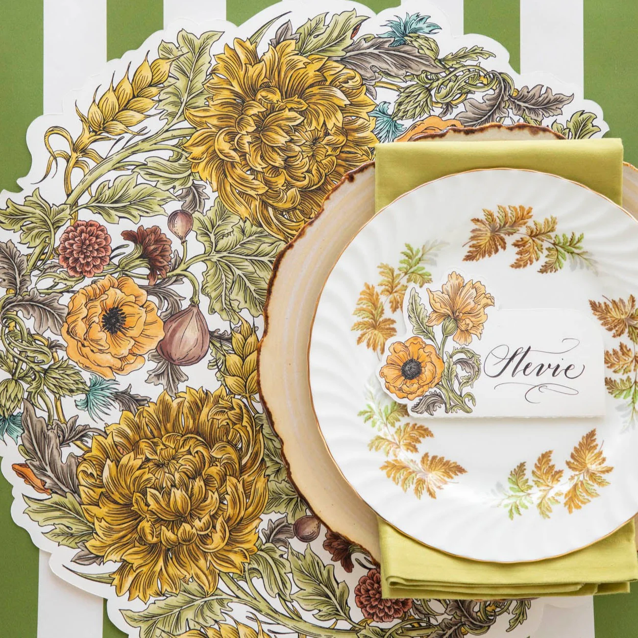 The Die-cut Autumn Acanthus Wreath is a festive frame your plate this harvest season. Golden chrysanthemums are the star of this bountiful gathering of fall leaves and florals, bringing the outdoors in for sunset-hued suppers and more.