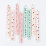 t's Christmas candle time! Enhance your seasonal decor with this stylish set of eight festive table candles, featuring a mix of timeless yet contemporary patterns and colors. The striking red and green wicks add a special touch, to create a warm, inviting glow. Perfect for your dinner table or mantel as a statement centerpiece, or display throughout your home. Beautifully packaged in a printed patterned keepsake box, they also make an elegant host gift or thoughtful present for someone who adores eye-catching candles.