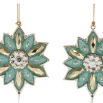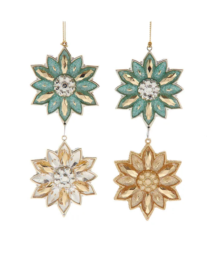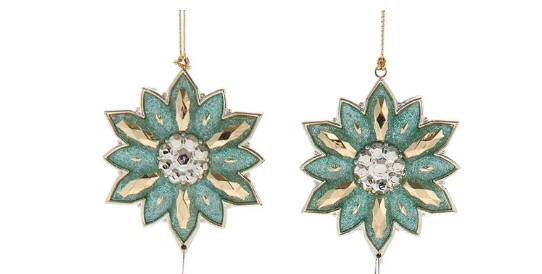 Brighten your holiday decor with Kurt Adler's exquisite Aqua & Gold Flower With Dangle Ornaments, featuring two beautifully assorted designs. Each ornament showcases a stunning flower adorned with intricate details, combining a soothing aqua color with elegant gold accents and charming dangle elements that add a playful touch. Crafted from high-quality plastic materials, these ornaments are perfect for enhancing your Christmas tree or creating eye-catching festive displays throughout your home. Their unique designs and vibrant colors create a delightful contrast, making them a lovely addition to any holiday decor style.