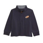 Interlock pullover features quarter zip neckline, gingham lining. side vent hem and embroidered football icon.