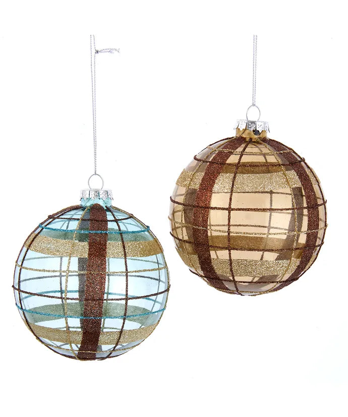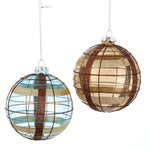 These glass translucent brown and blue ornaments are a beautiful addition to any holiday décor or Christmas tree. This assortment features a translucent brown and blue glass ball ornaments, each of these ornaments are decorated with a platinum and brown glittered striped design. 100MM