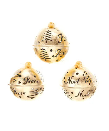 Decorate your home with these vintage-styled 50MM hanging bell ornaments from Kurt Adler. This assortment features three gold ball ornaments, each with a Christmas themed word. The words include, "Joy," "Peace" and "Noel." All of the ornaments in this assortment feature a bell inside.