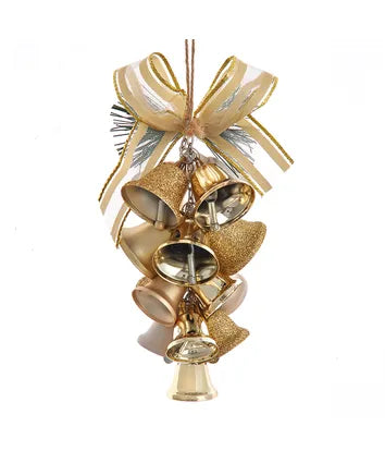 This Kurt Adler ivory & gold bell cluster ornament is a delightful addition to any holiday décor or Christmas tree. This ornament features a matte gold and a gold glittered design with silver details and includes a gold ribbon bow, silver tinsel accents and classic bell shapes as well as jingle bells!