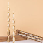 • 2 Ivory wax twisted candles with a gold ink stripe