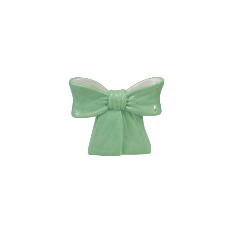 This hand-painted stoneware bow-shaped vase is not only a charming addition to any home decor, but also a unique and eye-catching accent. The vibrant green and pink polka dots add a playful touch to the piece, making it perfect for displaying fresh flowers or as a standalone decorative piece. Its high-quality craftsmanship and intricate detailing make it a standout piece that will surely impress guests and add a pop of color to any room. Add a touch of whimsy and elegance to your home with this beautiful vase.