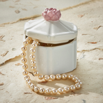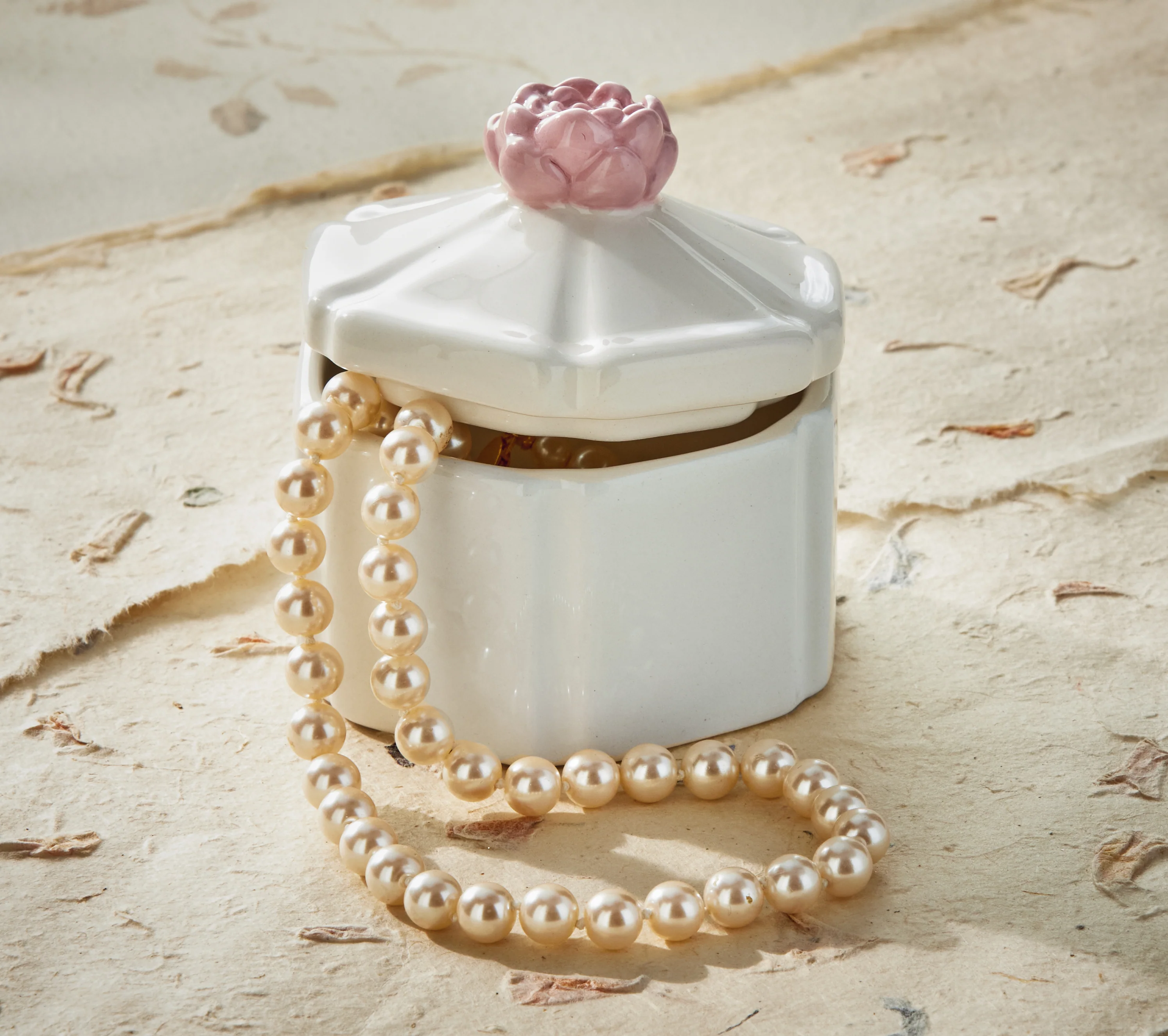 The Hex Flower Lidded Trinket Box has a faceted white ceramic body and a pink flower knob. Use it to hide rings, vitamins, keepsakes, or spare keys and group with candles for a pretty vignette.