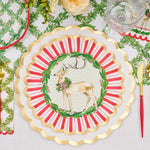 These scalloped-edge dinner plates from our Holly Berry collection feature a shimmering gold foil trim. The charming reindeer illustration stands against a holly berry and candy-cane backdrop that perfectly captures the essence of the holiday season. These plates are both durable and disposable, allowing you to skip the dirty dishes, without sacrificing quality and style. Your guests will never believe they’re disposable!