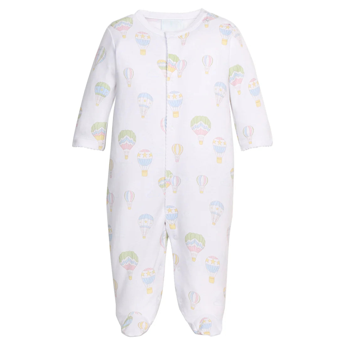 Made from our softest 100% Pima cotton, this Little English Printed Footie features playful, multi-colored hot air balloons. Tonal white picot trim adds a little extra detail and snaps down the front and legs make for easy dressing. A cheerful choice for baby girls or boys, this one-piece makes a great baby shower gift, especially when you aren't finding out the gender!