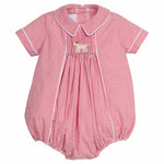 Celebrate a boy’s best friend in classic Little English style! Our Chest Smocked Bubble is a red seersucker gingham style with a hand-smocked lab at the center chest. With short sleeves, a peter pan collar, and white contrast piping, this sweet bubble is just what your baby boy's closet needs. Plus, big brother can coordinate perfectly in our Smocked Shortall - Lab.
