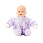 This beautiful 12" baby doll with blue eyes and light brown painted hair wears a lavender and white checked knit onesie. The onesie has a yoke, gathered body, long sleeves, footed feet and a Peter Pan collar. Lavender ribbon on the front and lace trim at the wrists and on the edge of the collar complete this baby's outfit. Ages 2+