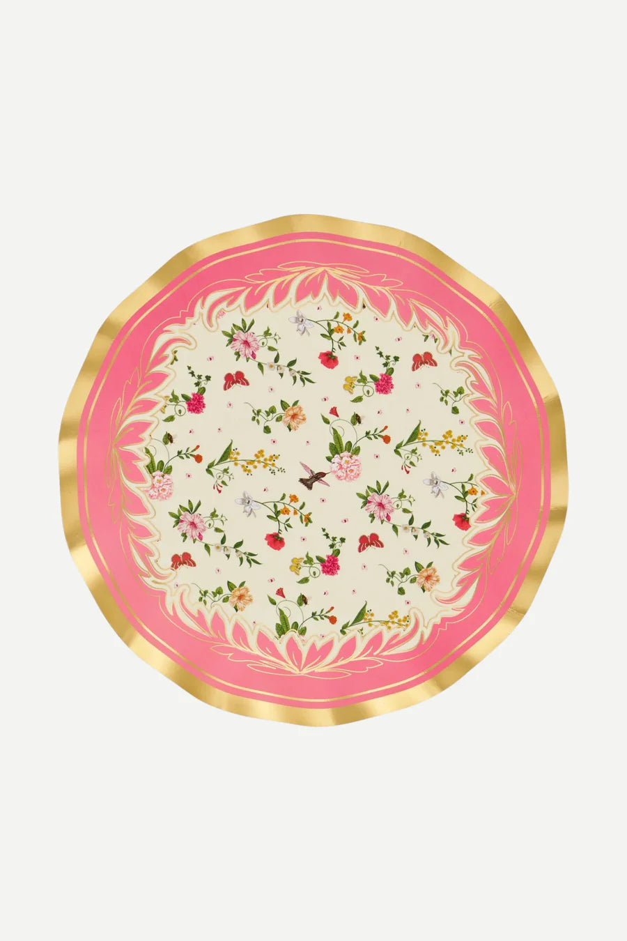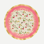 These wavy-edge dinner plates from our Rococo collection showcase soft pink hues adorned with graceful floral designs, accented with elegant gold foil trim. Their delicate, romantic aesthetic makes them perfect for adding a sophisticated touch to any gathering. Ideal for bridal showers, tea parties, or springtime celebrations..