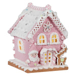 The house is adorned with delicate frosting swirls, candy-shaped decorations, and a sparkling flower detail above the door that adds a playful touch. Snowy drifts along the base complete the look, making this a standout addition to any holiday collection.