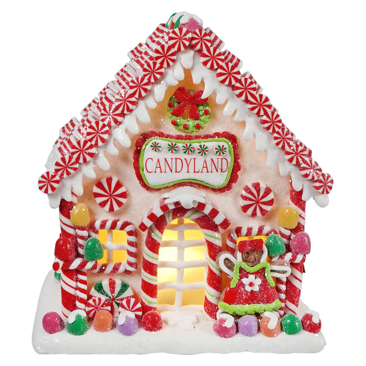 The house has a lovely warmth that enhances any Christmas display as the gentle lighting filters through the windows adorned with icing.  Whether positioned on a fireplace, side table, or as part of a larger village scene, its colorful design—complete with candy wreaths and dazzling details—makes it a striking item. Runs on three AA batteries (not included).