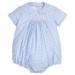 The Chest Smocked Bubble in Mayfair Gingham is a traditional hand-smocked style - a classic Little English look! With short sleeves and a peter pan collar, this sweet blue and white bubble is just what your baby boy's closet needs. Big brother can coordinate perfectly in our Chest Smocked Short Set! Plus, coordinating sibling styles from our Mayfair Collection make for timeless and elevated Easter family photos!