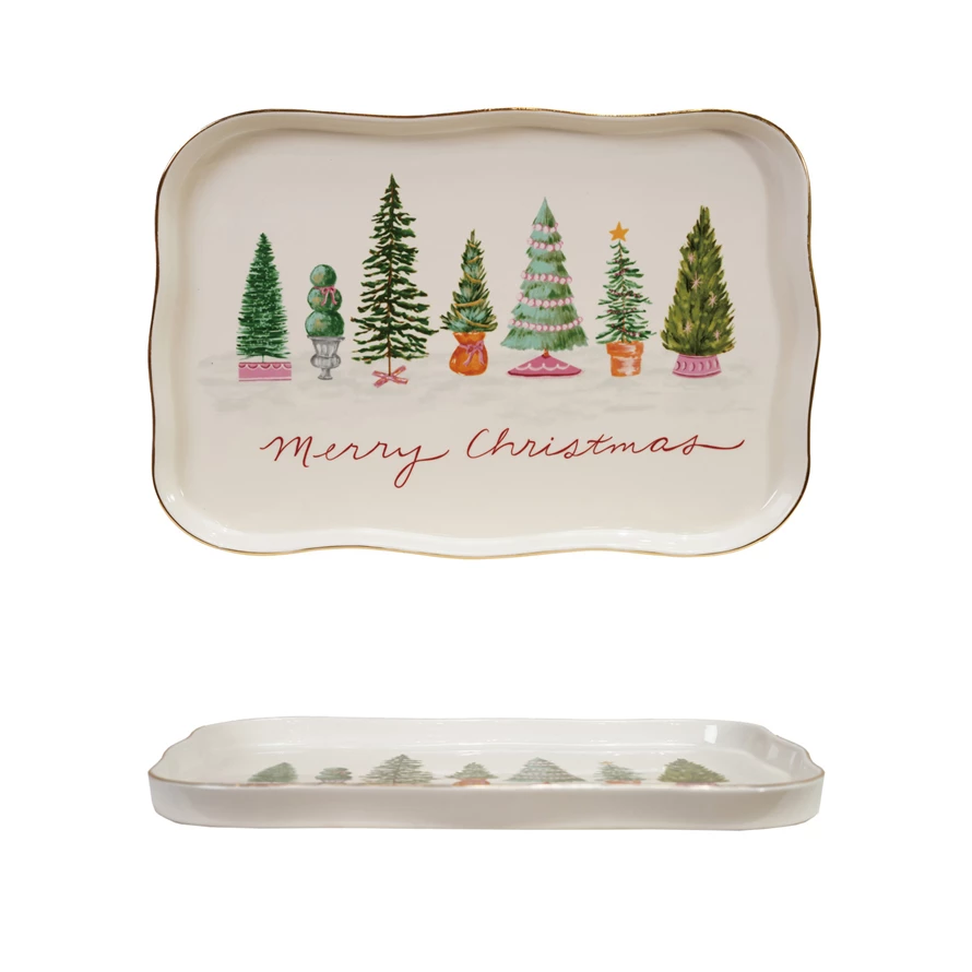 Celebrate the season with this charming 13"L x 8-3/4"W stoneware platter featuring delicate scalloped edges, festive tree designs, and elegant gold electroplating that spells out "Merry Christmas." Perfect for serving holiday treats or as a cheerful centerpiece, this platter adds a joyful splash of pink and sparkle to your festive gatherings.