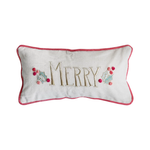 Bring a touch of whimsy to your holiday décor with this 8" x 9" slub lumbar pillow. Featuring hand-embroidered details, playful pom poms, festive piping, and a soft velvet back embroidered with "Merry," this cozy pillow adds charm and cheer to any space.