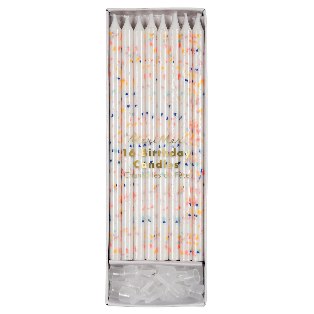 Is it really a celebration at all if no one leans over the cake and blows out the candles? Add a little extra touch of color to your party with this set of 16 tall candles, decorated with multicolored neon flecks.