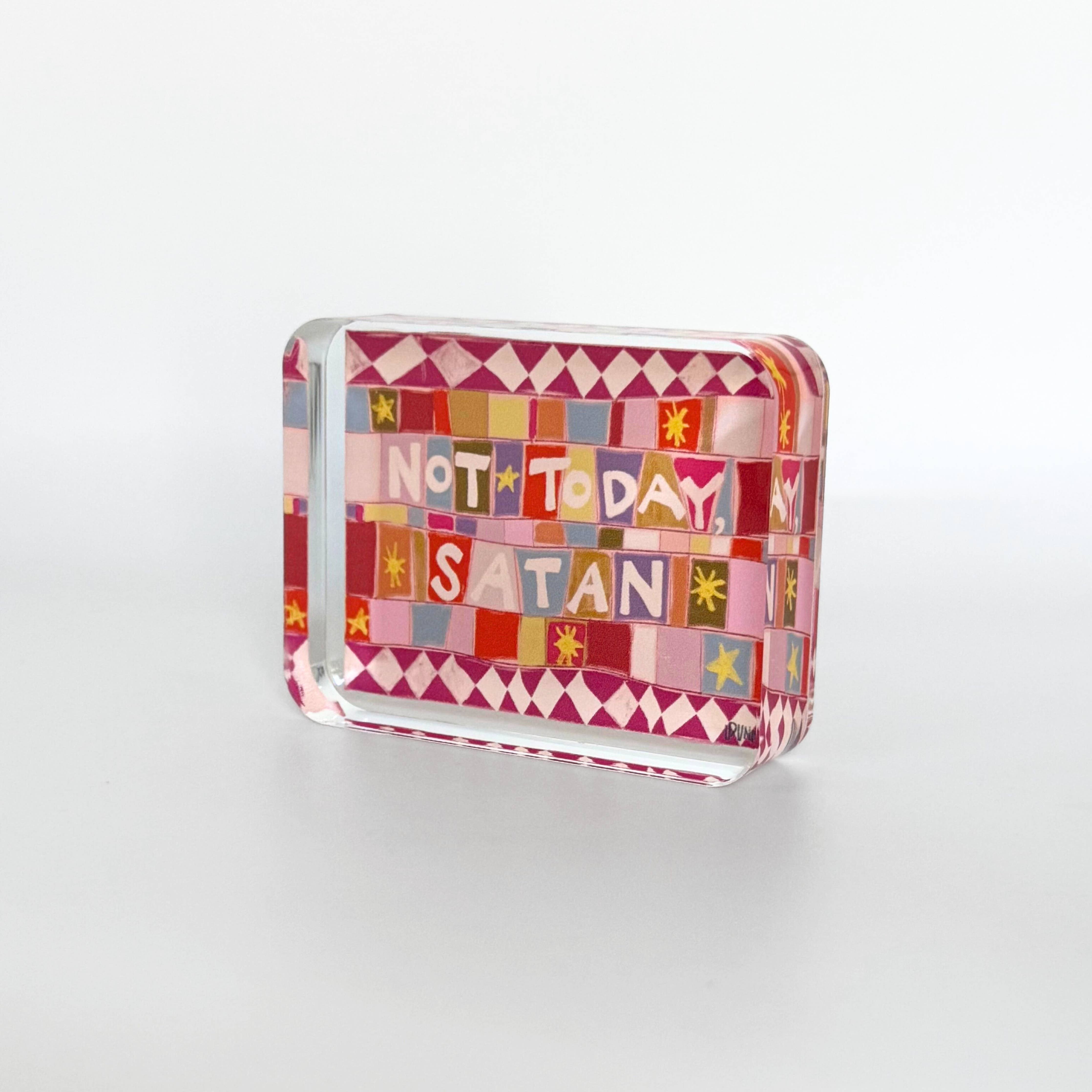 "Not Today, Satan" Our "Humor Me" Acrylic block collection is a fun way to add a touch of humor to everyday life. Whether it captures an inside joke, a familiar personality trait, or a moment we can all relate to, this piece is made to bring a smile to anyone who sees it. Details • 2.25" tall, .75" thick • Free-standing, cut-to-shape block • Easy to display on a desk, shelf, or tabletop