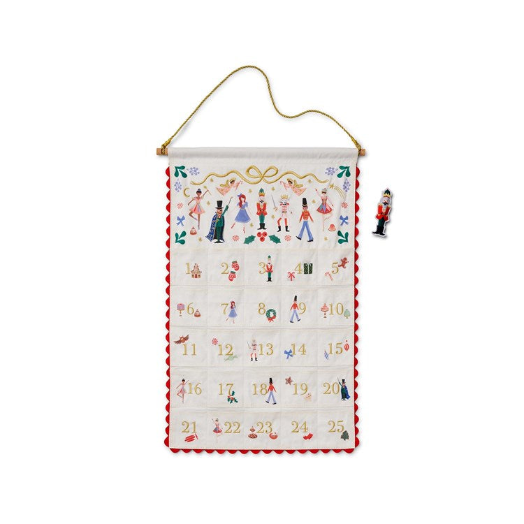 Countdown to Christmas with our fabric advent calendar, with embroidered designs and a felt Nutcracker figurine to move from day to day. The calendar hangs from a dowel with a gold cord for display.