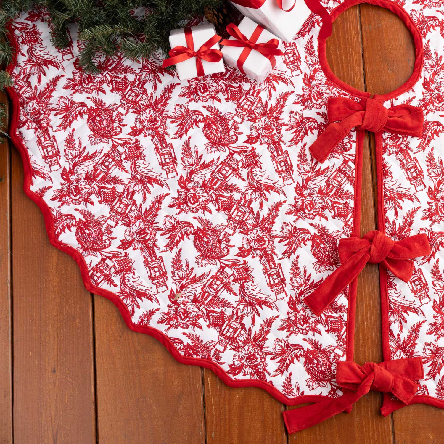 Welcome your holiday season in the most luxurious way with the Nutcracker Toile Quilted Tree Skirt! This gorgeous piece of decor is made from 100% pure cotton, creating a texture that is both soft and strong, bringing a sense of effortless elegance to any room. Featuring an intricately printed nutcracker toile design, you can be sure that all eyes will be drawn to your beautifully decorated tree. Whether you’re adding some extra wow factor to your own home or sending it as the perfect gift for someone special, the Nutcracker Toile Quilted Tree Skirt will bring class, style and joy into any setting this Christmas season! 54" x 54" x 1" Printed 100% Cotton Machine Wash Cold, Gentle Cycle. Do Not Bleach. Line Dry or Tumble Dry Low. Do Not Iron. Do Not Dry Clean. Designed in the USA; Imported
