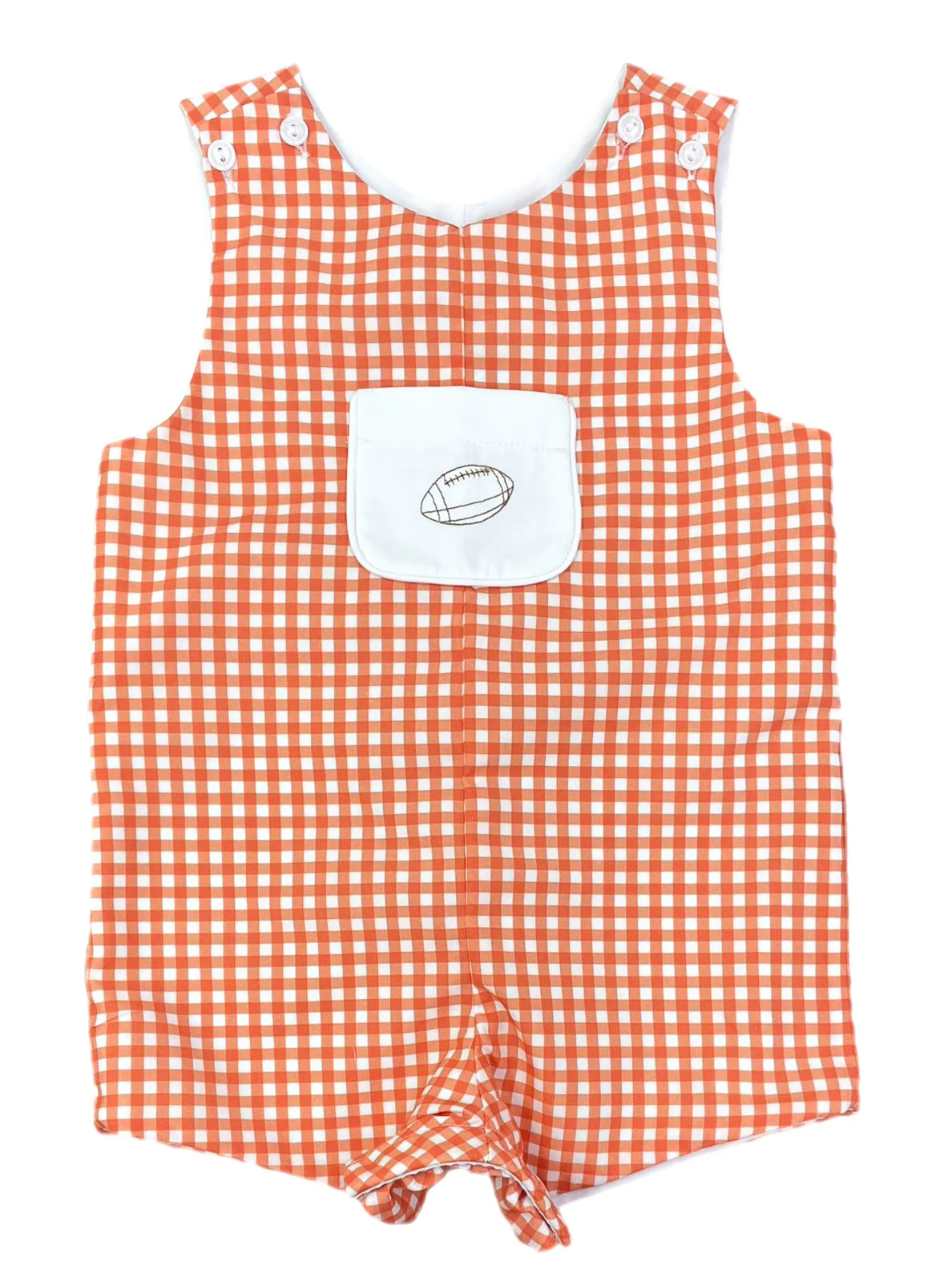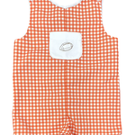 Prepare your little football fan for game day with the Orange Gingham Game On Emmett Jon Jon. This adorable romper features a classic orange gingham pattern that captures the spirit of the season. Designed for comfort and ease, it lets your toddler move freely while cheering on the team. Perfect for football games and family gatherings, this outfit combines style and practicality for your little one’s big day.