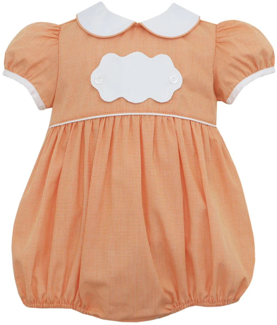 Get game day ready with the Orange Gingham Girl's Short Bubble featuring a charming scallop tab detail. This playful outfit combines bright gingham with a cute scalloped touch, making it perfect for spirited celebrations and comfortable all-day wear. Ideal for little girls who love to show off their style while cheering on their team.