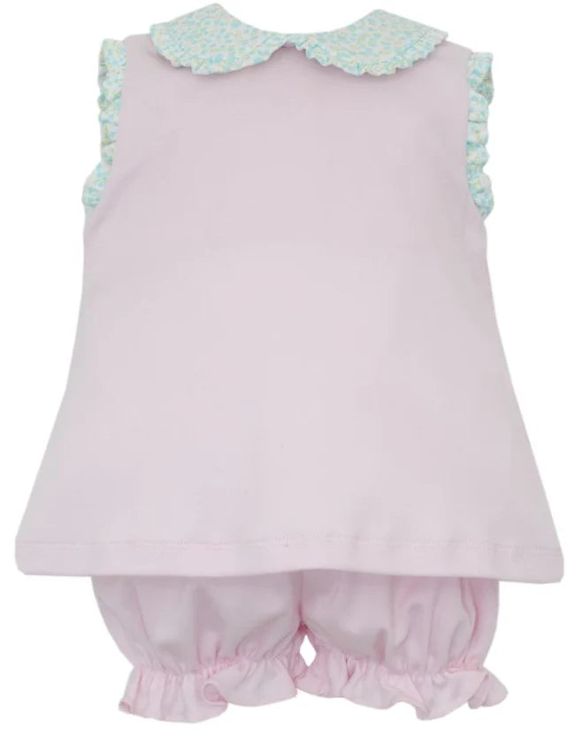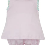 Meet the perfect spring duo! This charming bloomer set pairs a soft pink top with matching bloomers, both accented with delightful aqua floral trim. The sleeveless design is ideal for warm weather play, while the bloomer silhouette gives her freedom to run, jump, and explore. Mix-and-match friendly with other pieces in her wardrobe, this set brings effortless spring style with a touch of whimsy. Perfect for playdates, outdoor adventures, or simply looking adorable all season long.