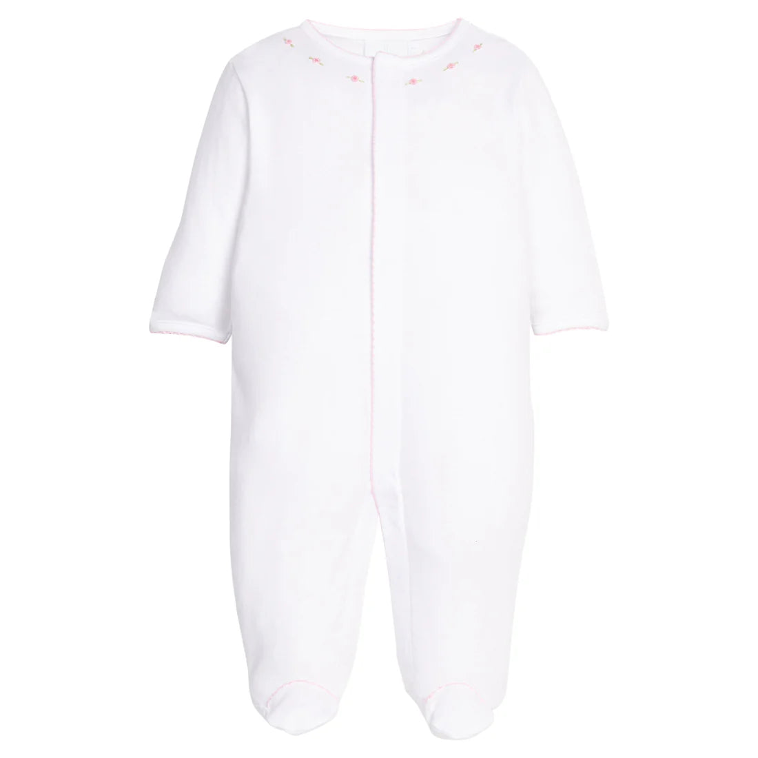 Spring is in bloom with our new Embroidered Footie - Primrose! Made from 100% Pima cotton, this soft white footie features pink picot trim and pink rosette embroidery along the collar. With long sleeves and legs and snaps for easy dressing, this soft, snuggly style is a great gift for baby girls this season. Want to make it uniquely hers? This simple design is just perfect for monogramming!