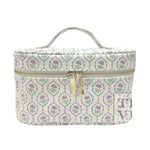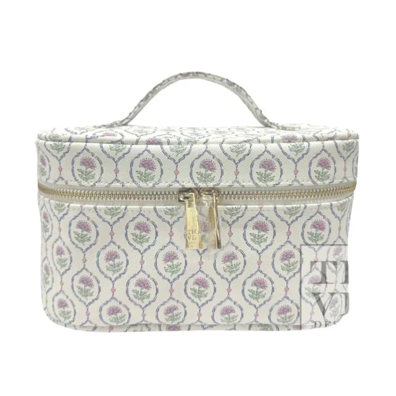 Introducing TRVL Designs NEW LARGER Train Case, the Train2 case - crafted in vegan Saffiano leather with an interior made with our coated liquid gold liquid liner that is completely wipeable - built for the beauty product lover! They have added more height to the case to fit all your favorite things, including brushes in the lid. Featured with a top handle, a 2-way gold logo zipper puller, an inside removable clear pouch, elastic pockets around the base and elastic loops on the backwall and a gold dust bag.