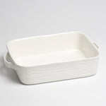 11″ x 9″ Rectangular Baking Dish in Le Blanc. Impress with your culinary skill and presentation by serving up delicious entrees or pastries in this elegant dish.  Versatile high-fired porcelain pieces that are microwave safe! Beautifully crafted with clean lines and organic shapes. Food safe, tarnish free, dishwasher safe, oven safe to 500°. Easy Care. Capacity: 2.75 qt